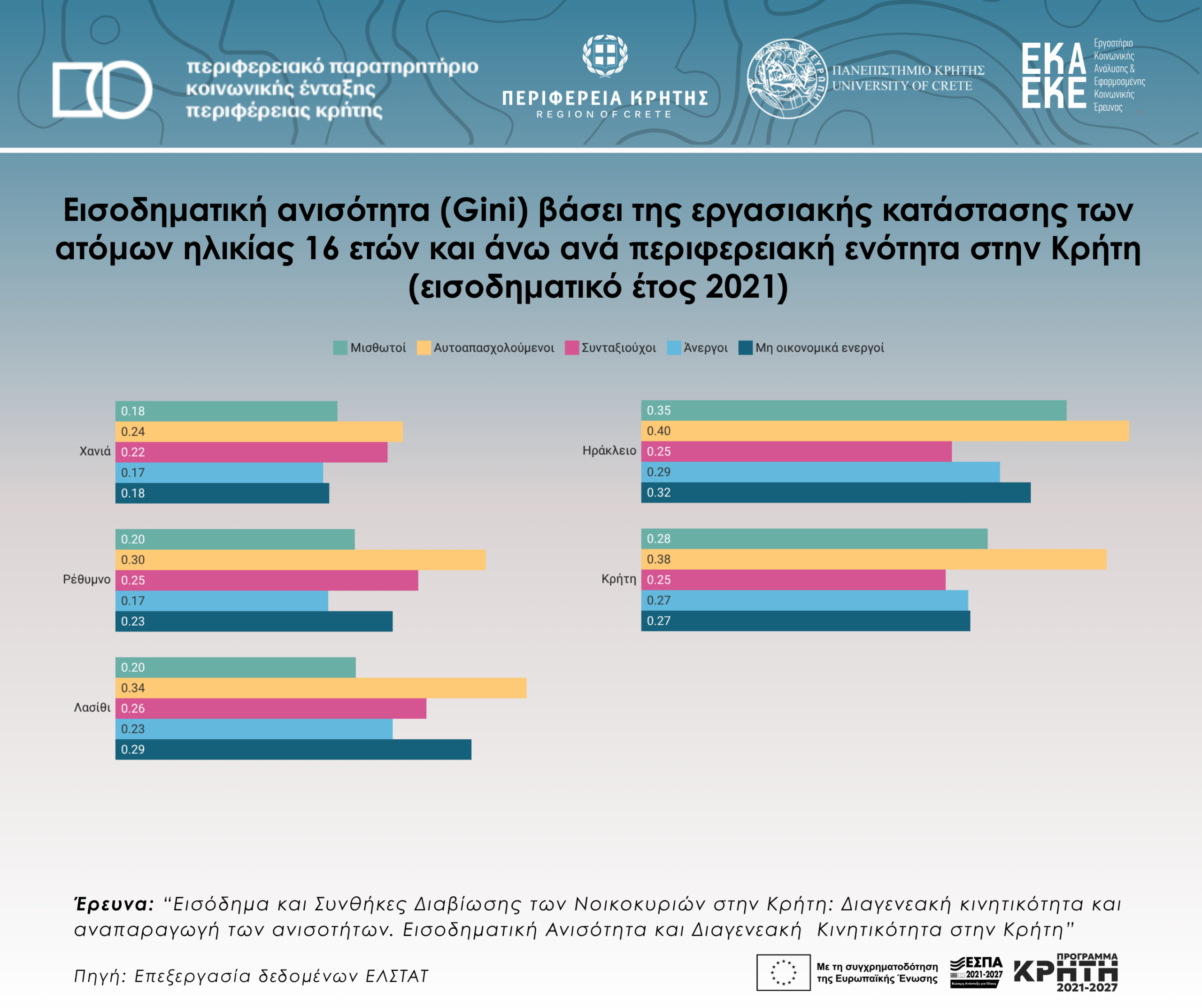 Εισοδηματική ανισότητα (Gini) βάσει της εργασιακής κατάστασης των ατόμων ηλικίας 16 ετών και άνω ανά περιφερειακή ενότητα στην Κρήτη (εισοδηματικό έτος 2021)