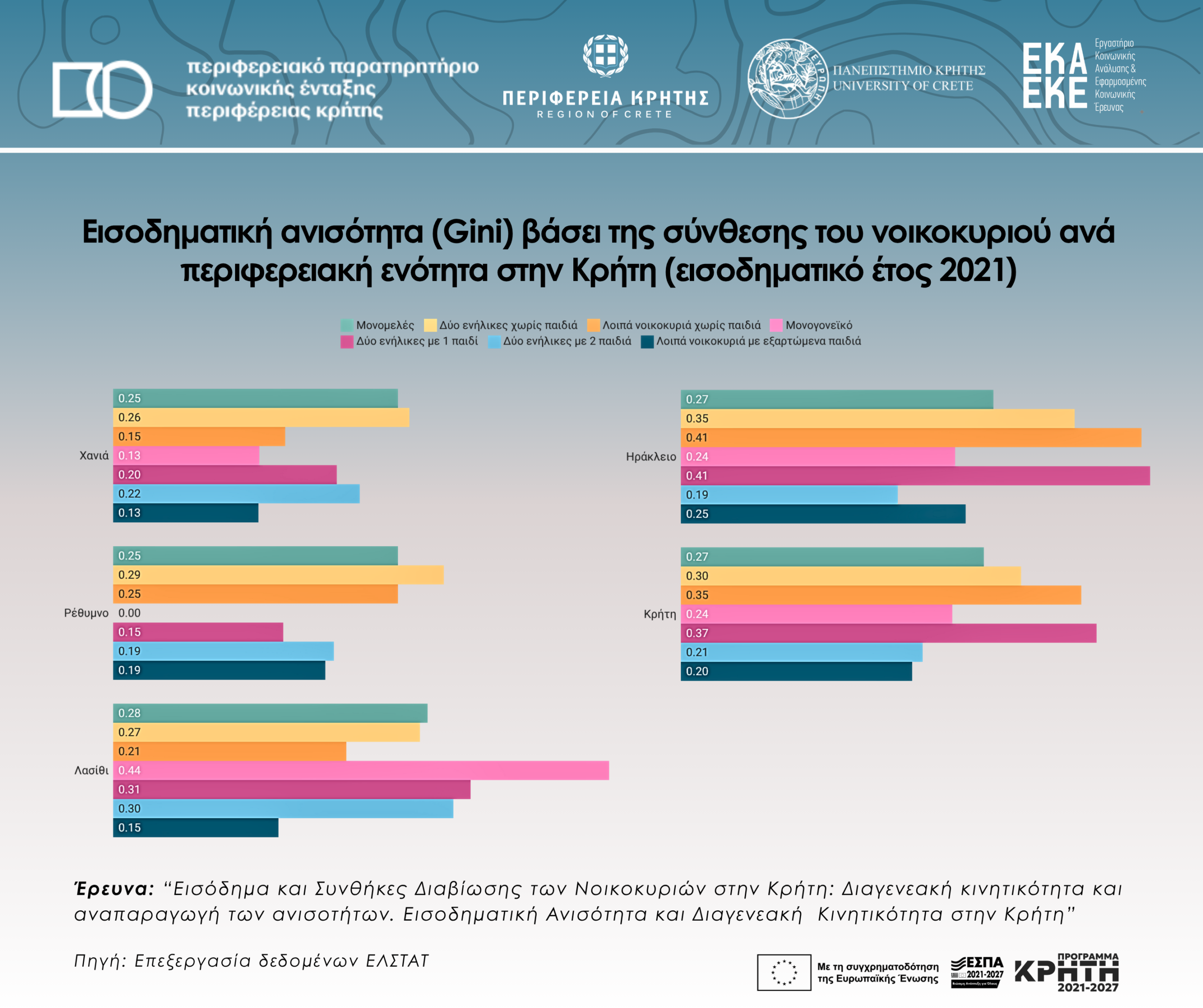 Εισοδηματική ανισότητα (Gini) βάσει της σύνθεσης του νοικοκυριού ανά περιφερειακή ενότητα στην Κρήτη (εισοδηματικό έτος 2021)