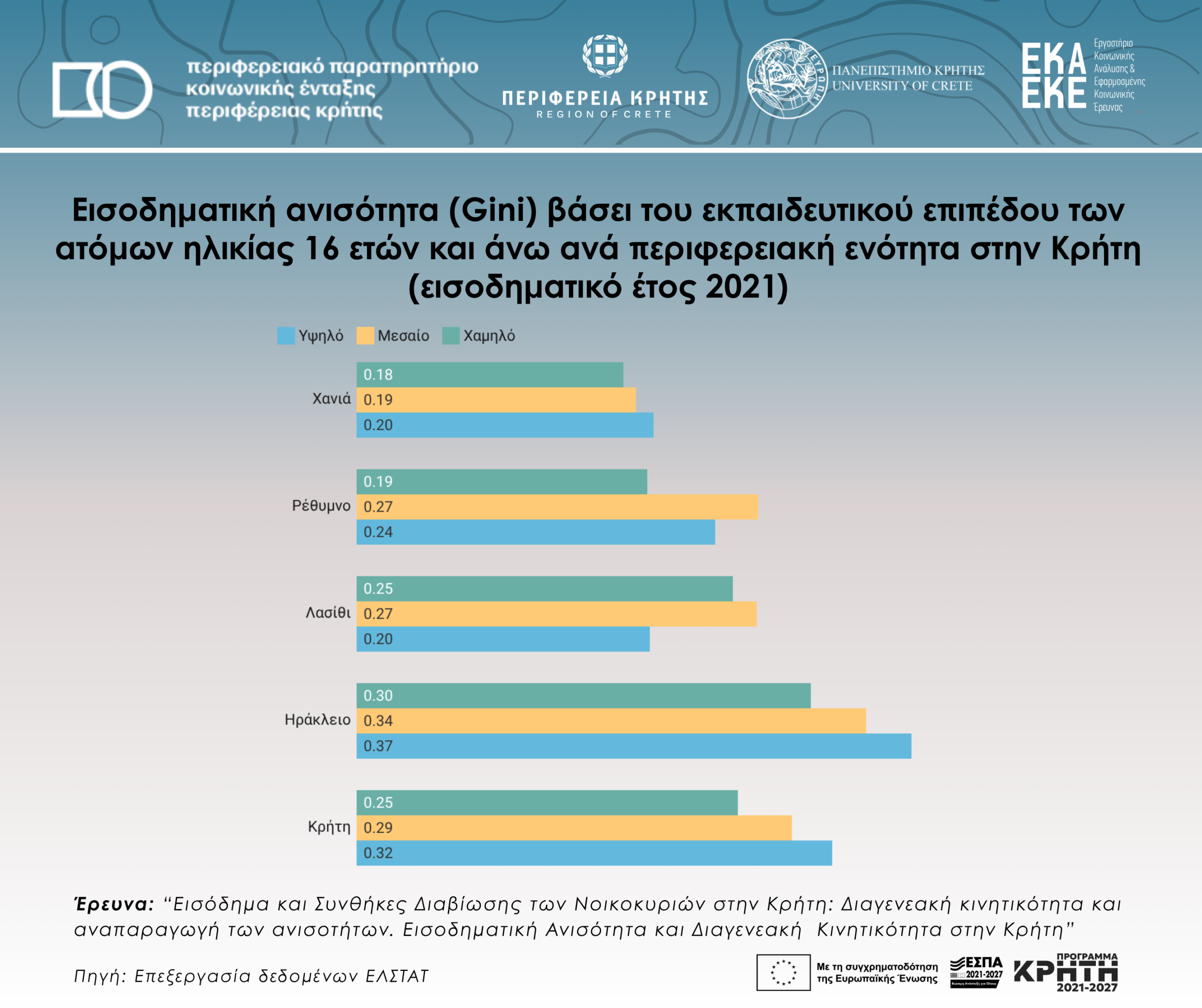 Εισοδηματική ανισότητα (Gini) βάσει του εκπαιδευτικού επιπέδου των ατόμων ηλικίας 16 ετών και άνω ανά περιφερειακή ενότητα στην Κρήτη (εισοδηματικό έτος 2021)