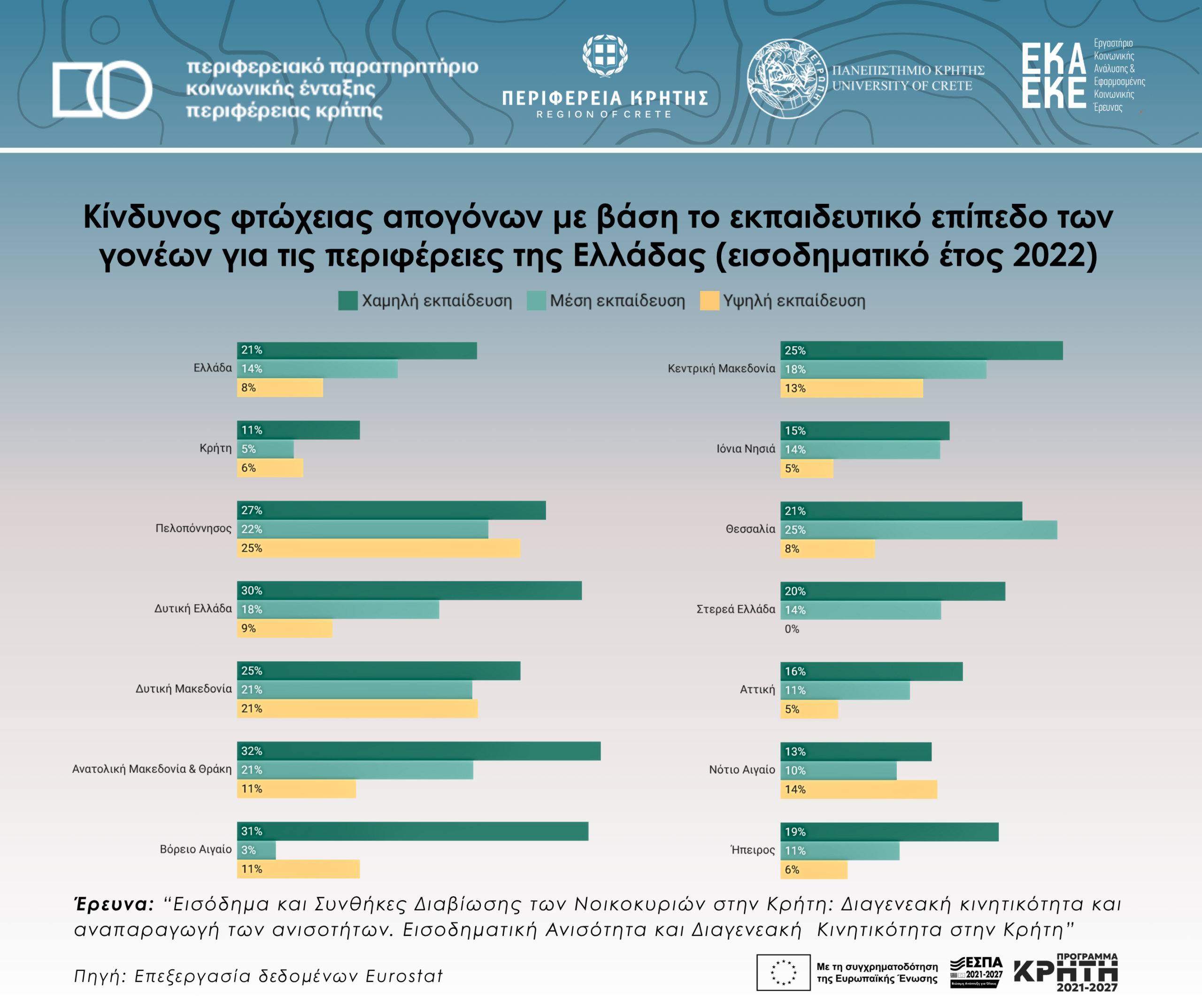 Κίνδυνος φτώχειας απογόνων με βάση το εκπαιδευτικό επίπεδο των γονέων για τις περιφέρειες της Ελλάδας (εισοδηματικό έτος 2022)