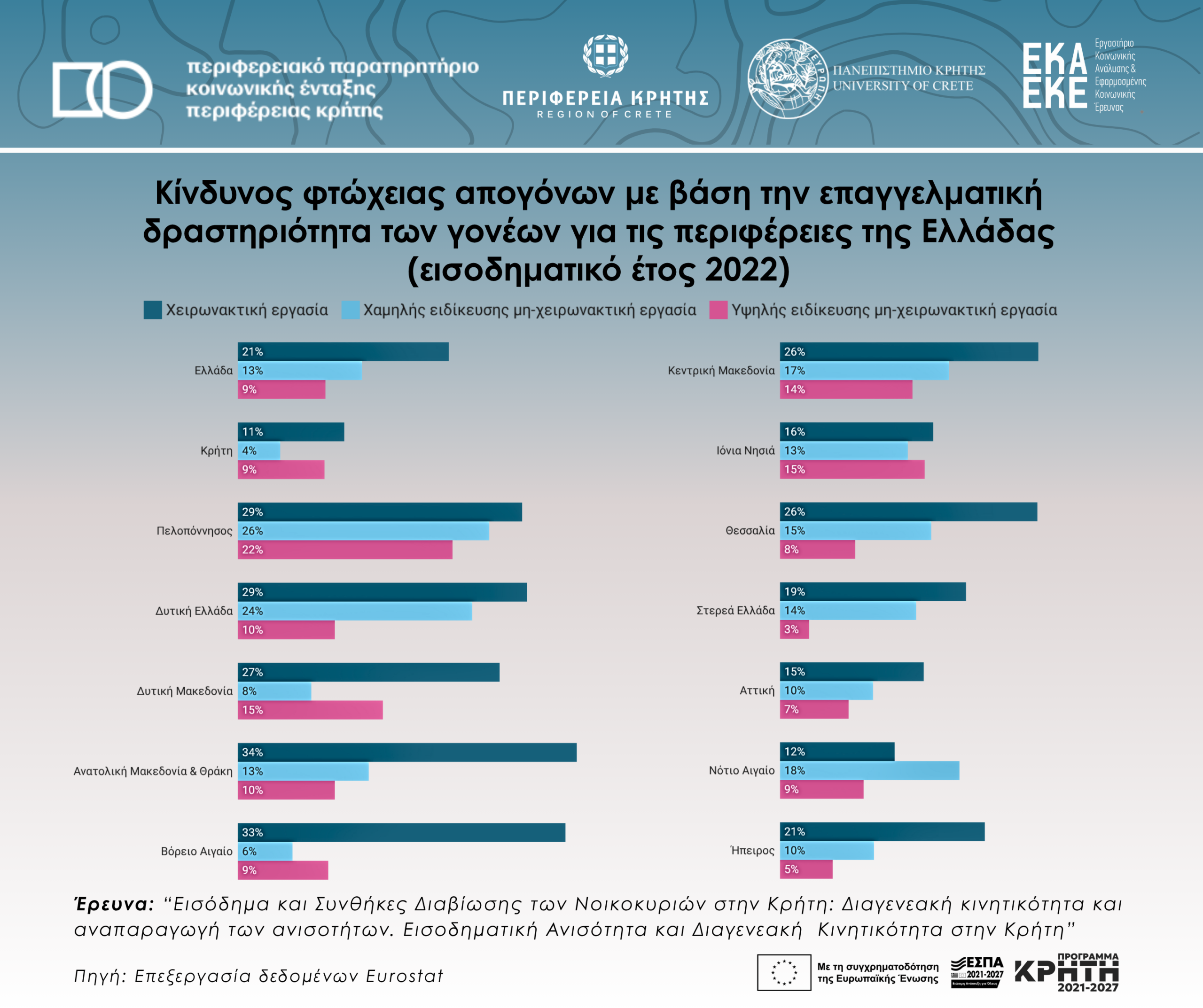 Κίνδυνος φτώχειας απογόνων με βάση την επαγγελματική δραστηριότητα των γονέων για τις περιφέρειες της Ελλάδας (εισοδηματικό έτος 2022)