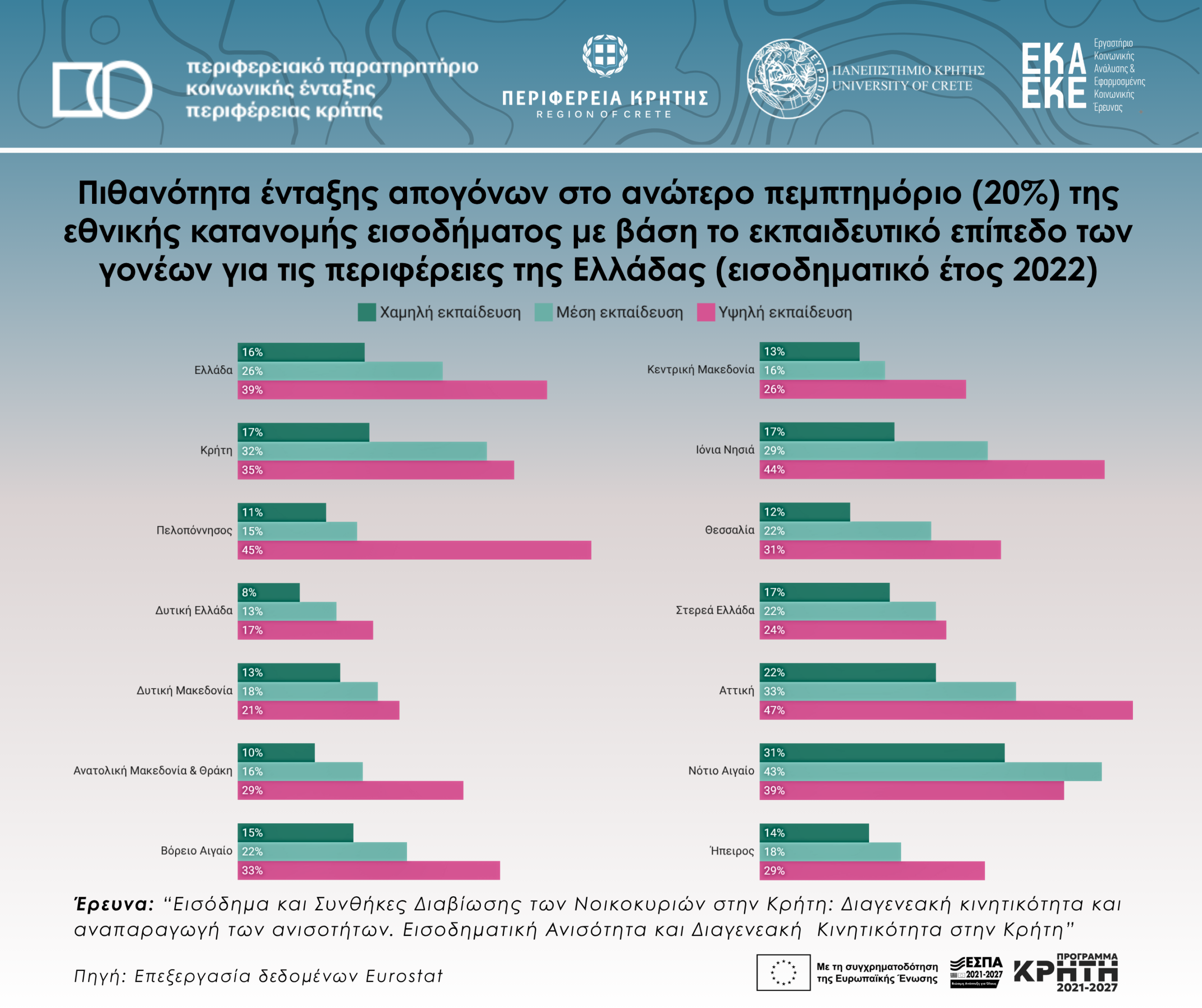 Πιθανότητα ένταξης απογόνων στο ανώτερο πεμπτημόριο (20%) της εθνικής κατανομής εισοδήματος με βάση το εκπαιδευτικό επίπεδο των γονέων για τις περιφέρειες της Ελλάδας (εισοδηματικό έτος 2022)