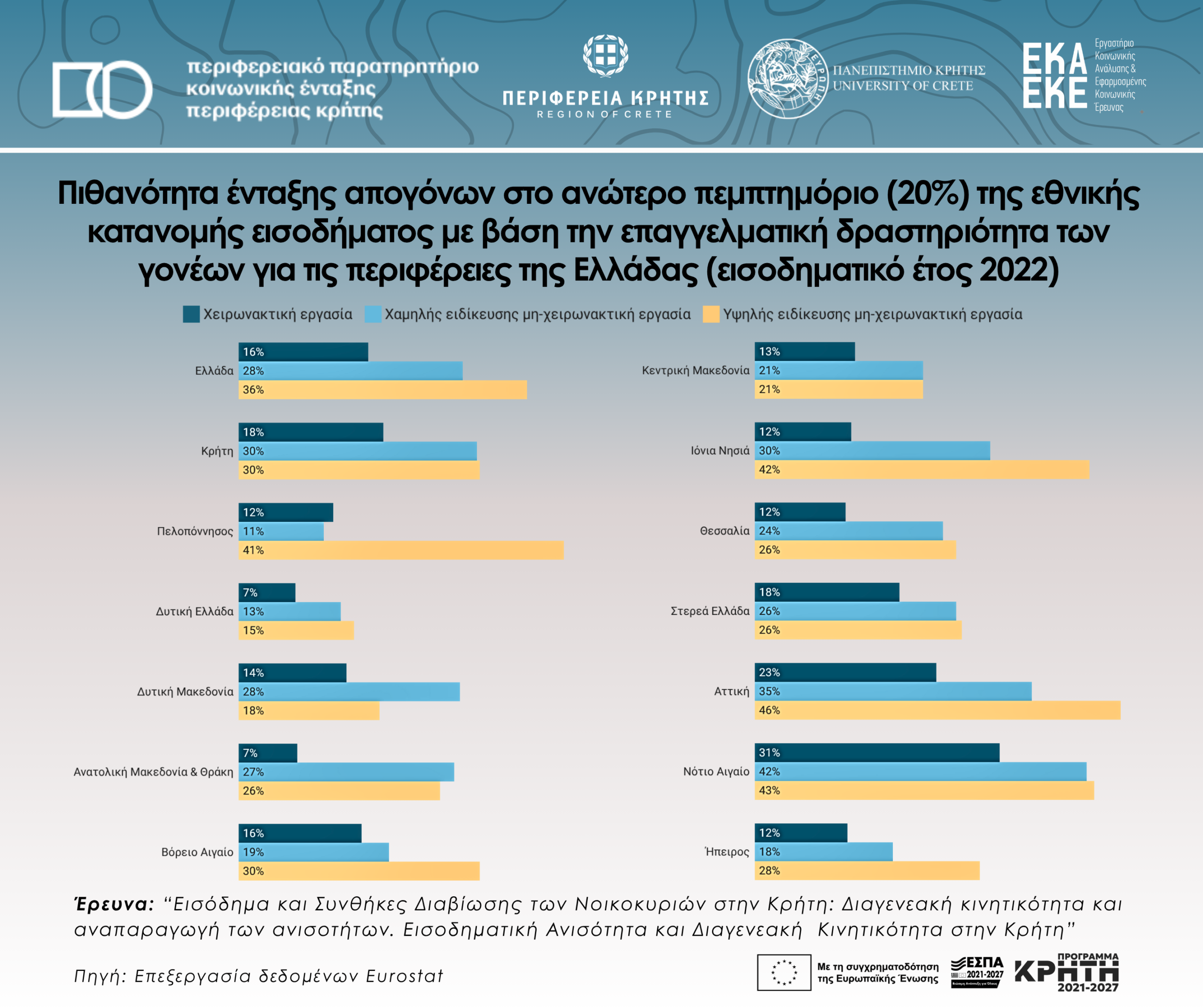 Πιθανότητα ένταξης απογόνων στο ανώτερο πεμπτημόριο (20%) της εθνικής κατανομής εισοδήματος με βάση την επαγγελματική δραστηριότητα των γονέων για τις περιφέρειες της Ελλάδας (εισοδηματικό έτος 2022)