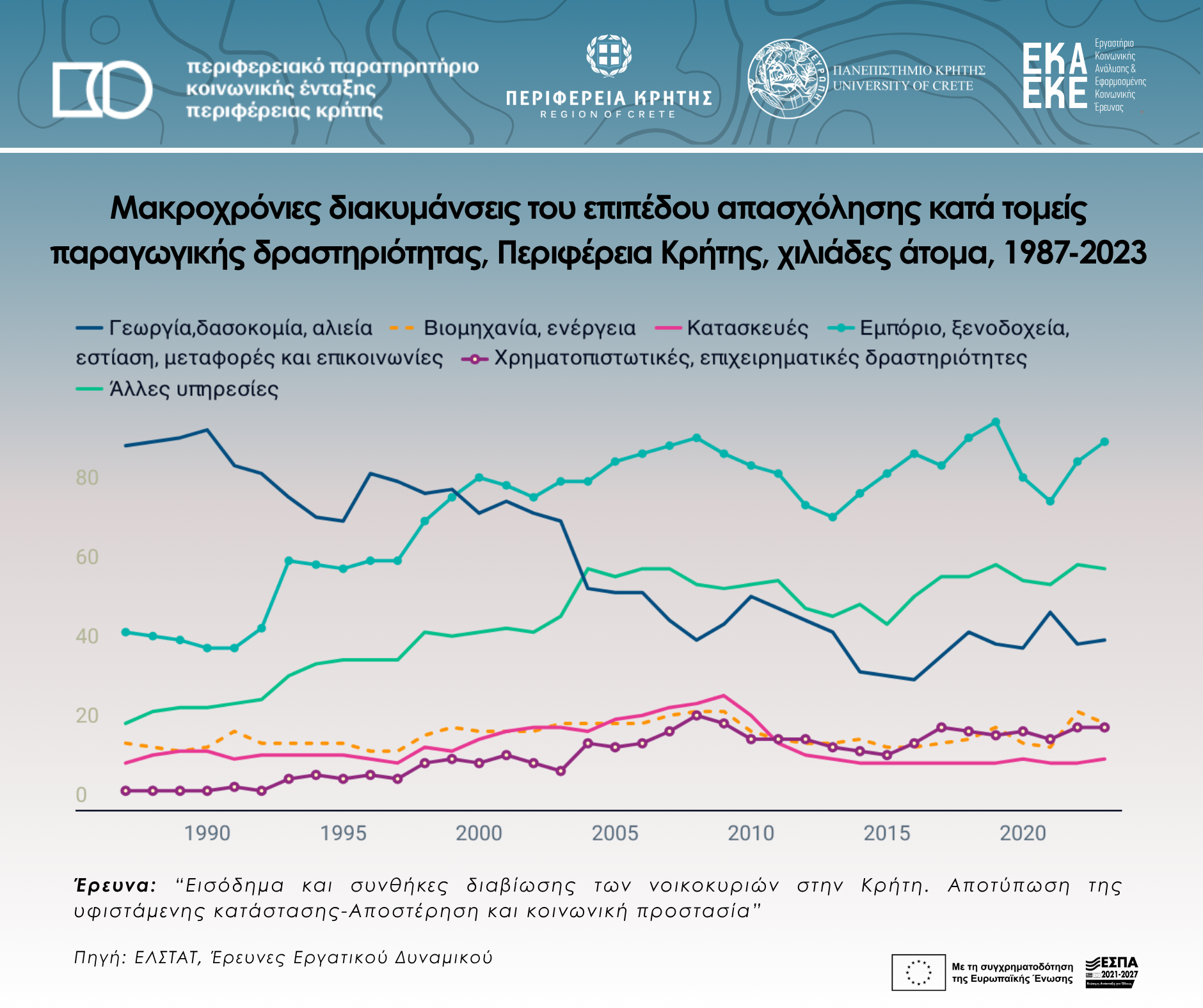 Long-term fluctuations in the level of employment by sectors of productive activity, region of Crete, thousands of people, 1987-2023
