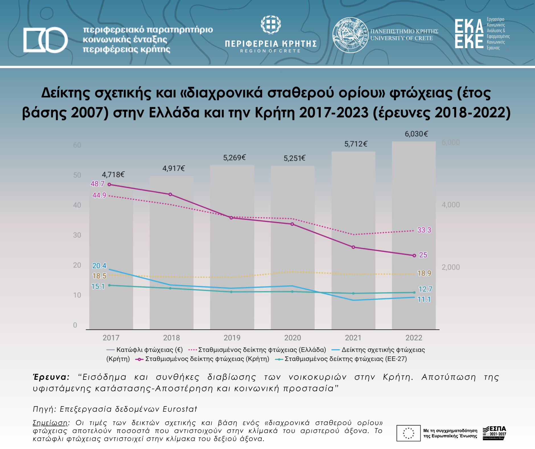 Relative and “over time stable threshold” poverty index (base year 2007) in Greece and Crete 2017-2023 (surveys 20018-2022)