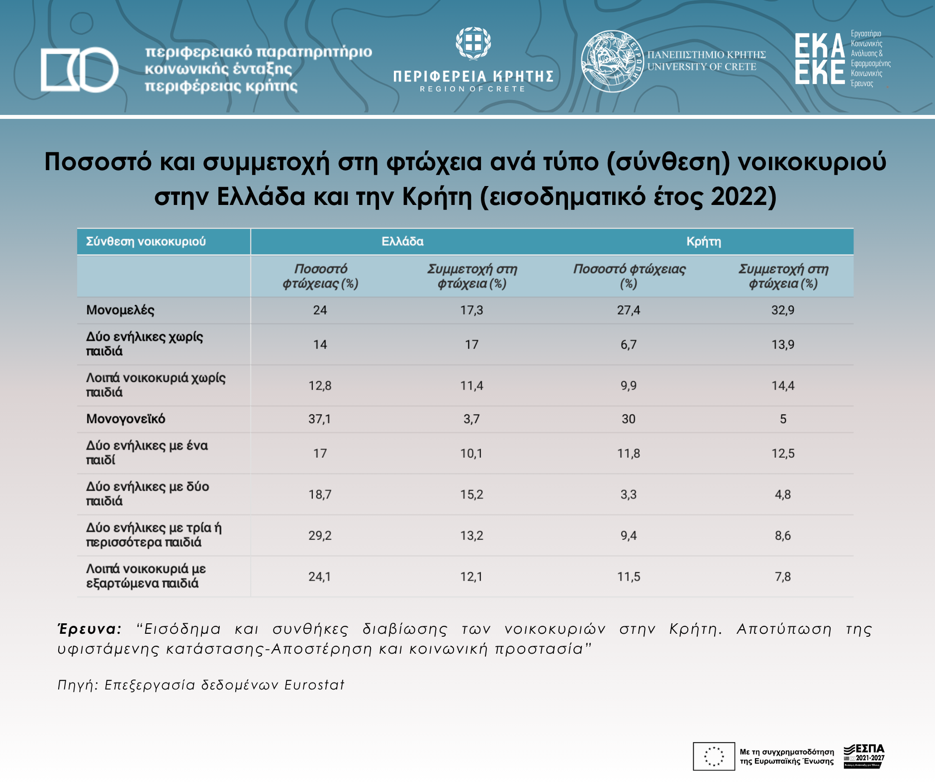 Poverty rate and participation by household type (composition) in Greece and Crete (income year 2022)