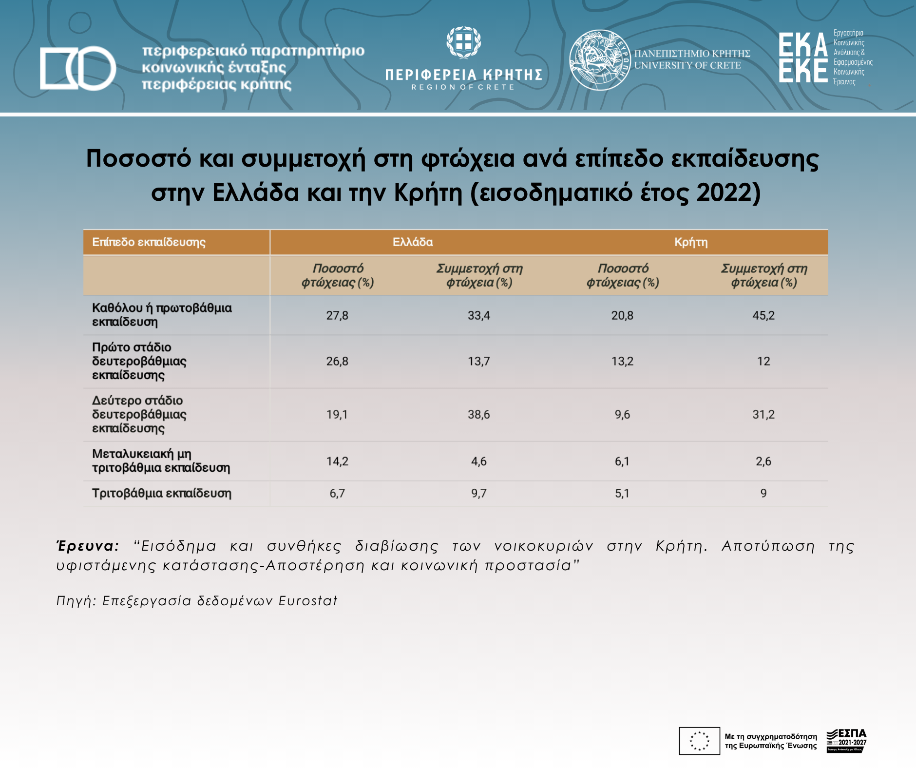 Poverty rate and participation by education level in Greece and Crete (income year 2022)