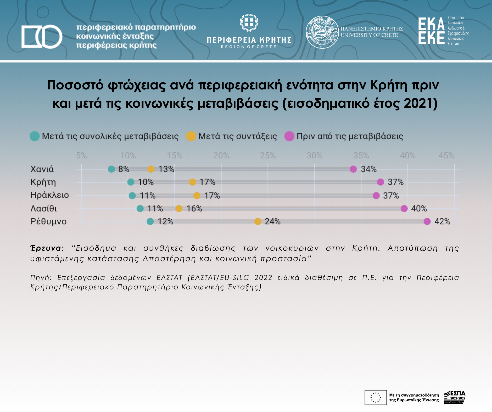 Poverty rate by regional unit in Crete before and after social transfers (income year 2021)