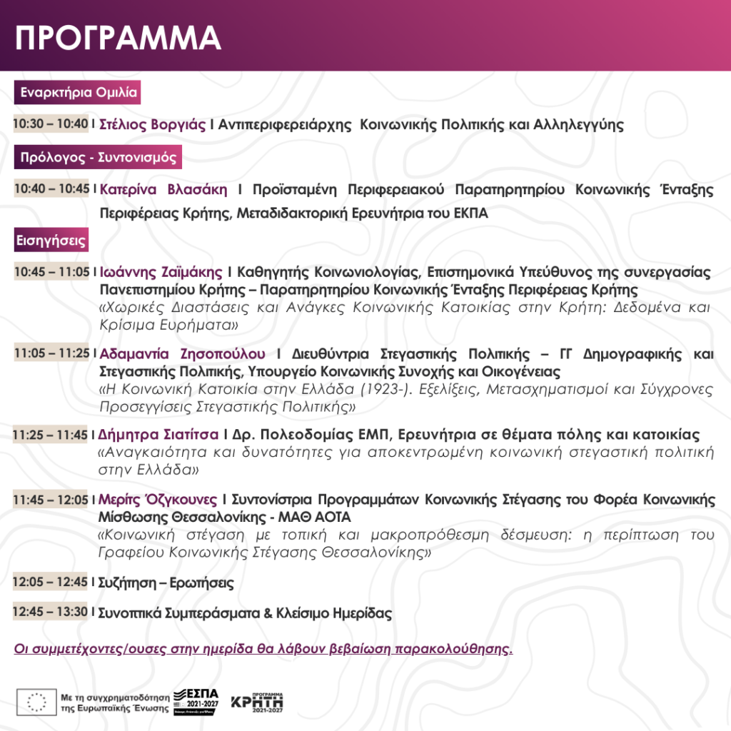 Η ημερίδα εντάσσεται στις δράσεις του Περιφερειακού Παρατηρητηρίου Κοινωνικής Ένταξης Περιφέρειας Κρήτης, στο πλαίσιο της Περιφερειακής Στρατηγικής για την Κοινωνική Ένταξη (ΠΕΣΚΕ), σε ευθυγράμμιση με την Εθνική και Ευρωπαϊκή Στρατηγική για την κοινωνική συνοχή και τη βιώσιμη ανάπτυξη.